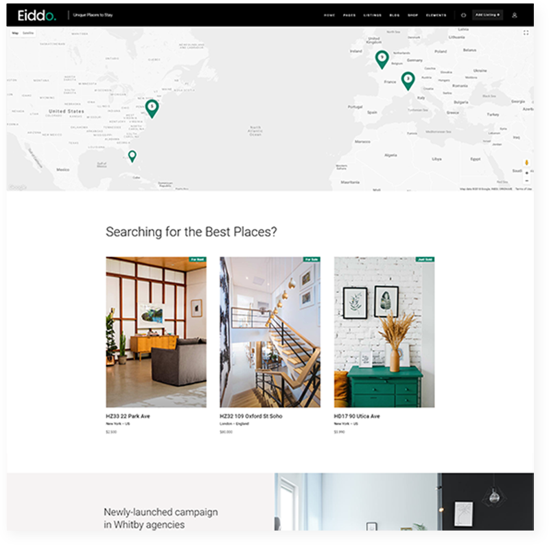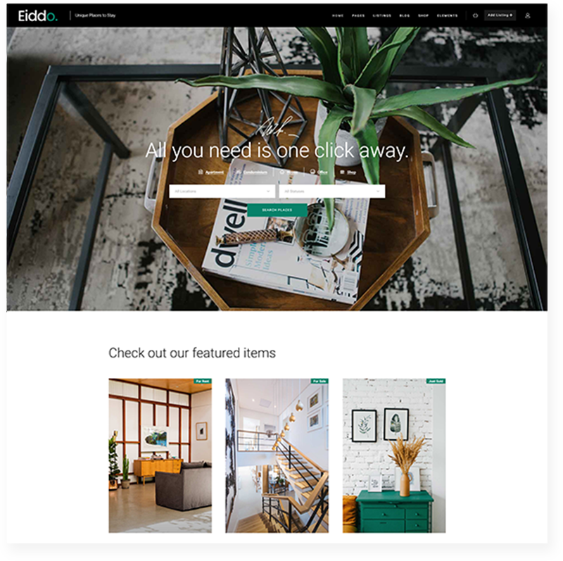 The ideal way to create a full-blown real estate website you always wanted. Eiddo provides you with absolutely all the elements & features you will ever need – simply import the theme demo content & you get a premade basis for online perfection.