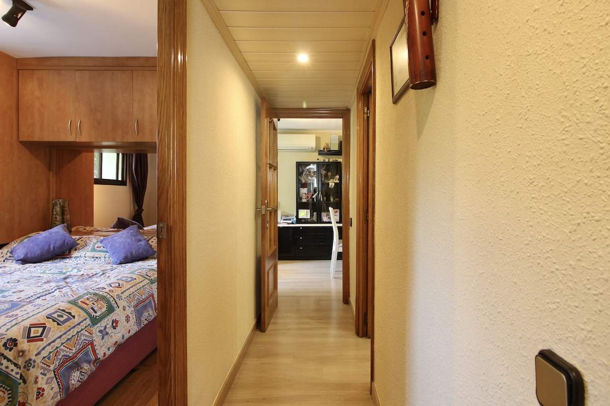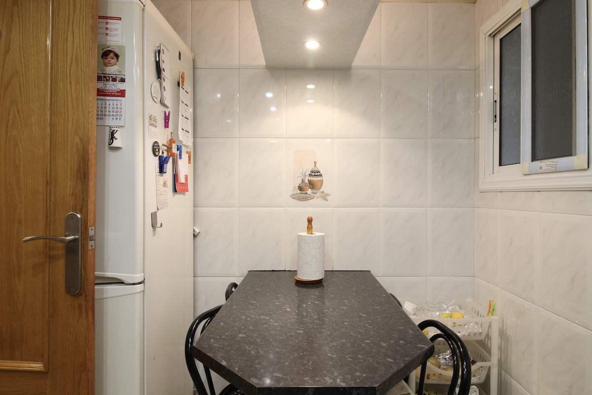 La entrada nos conduce al salón comedor, acogedor y con buena luz natural. Desde aquí accedemos al pasillo distribuidor que conecta con el resto de la vivienda: una cocina tipo office y amplia, con espacio para comer, desde donde se accede a la galería con más espacio de almacenamiento y zona tendedero. Un baño completo de cuatro piezas con plato de ducha; y por último tres habitaciones exteriores, una doble y dos individuales, todas con luz y ventilación natural.