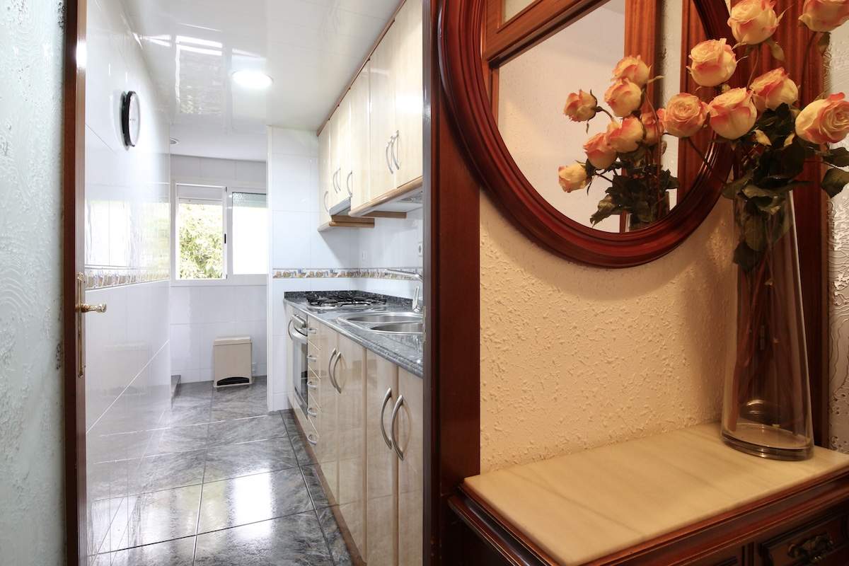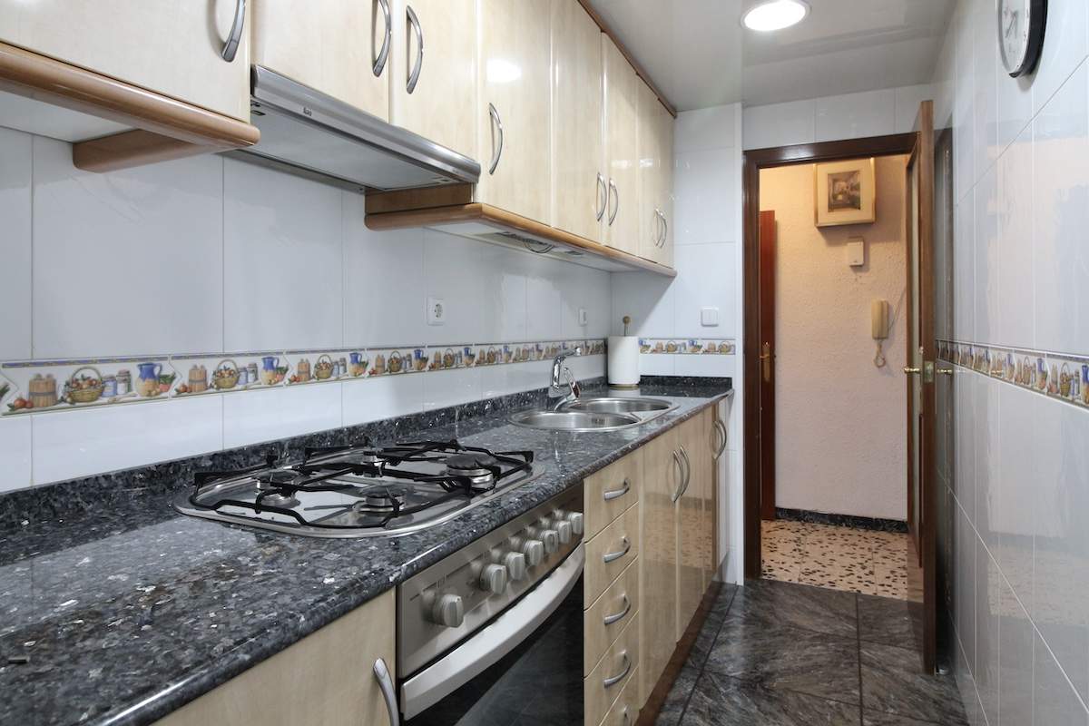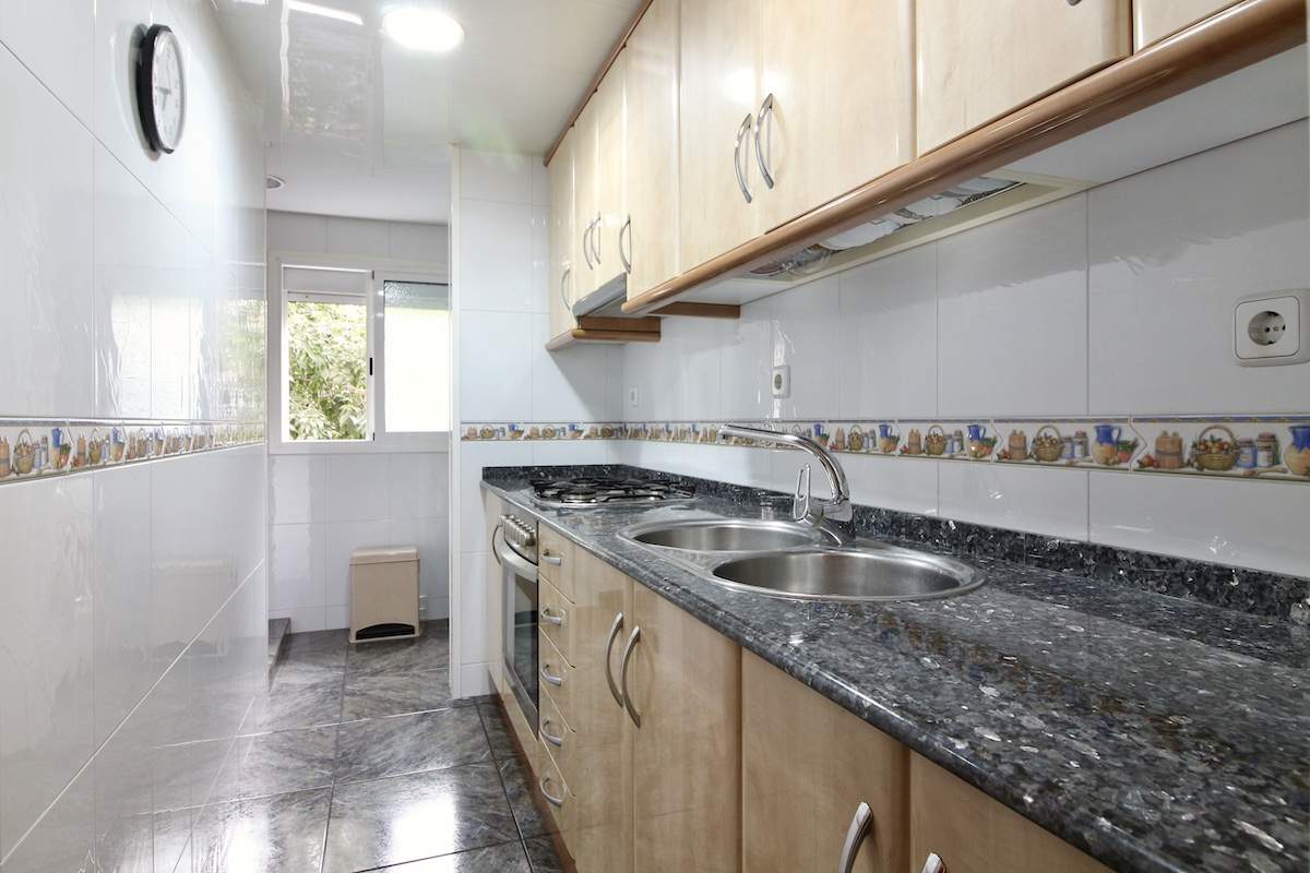 · A la izquierda, la cocina en buen estado con zona tipo lavadero y un espacio ideal donde hay un armario para guardar lo que necesites.