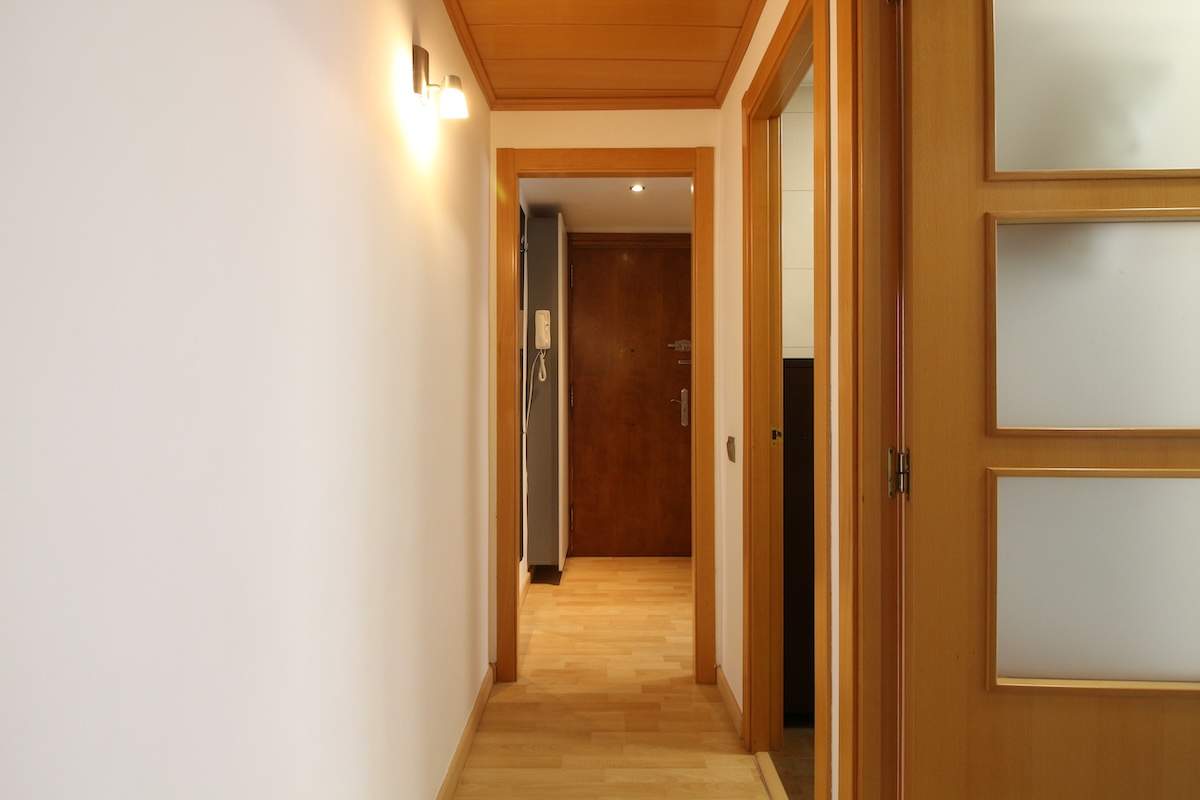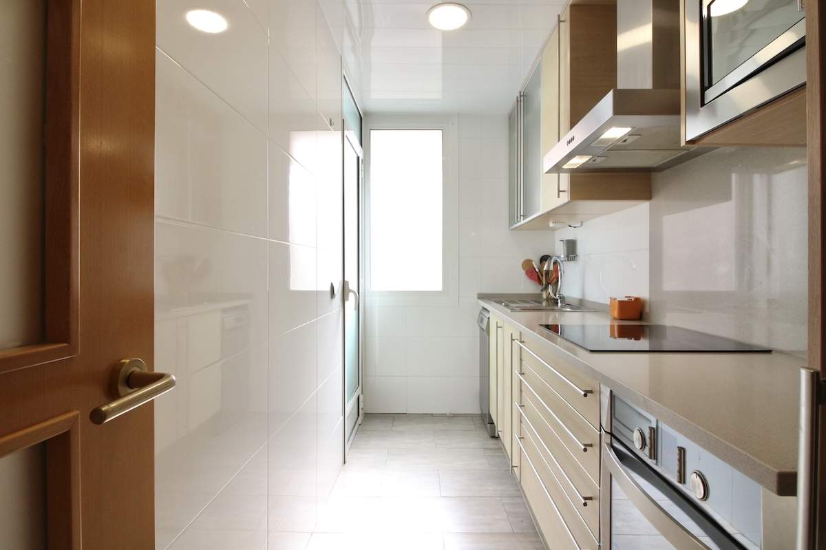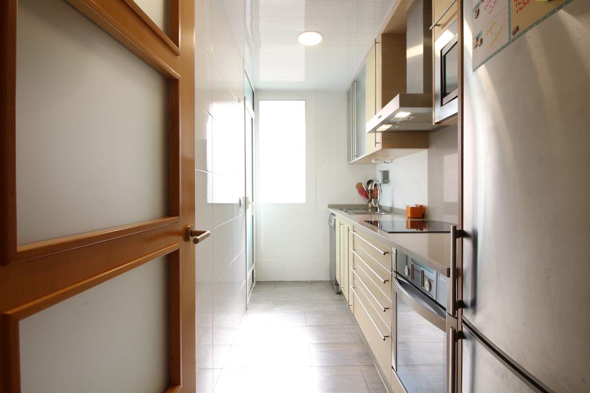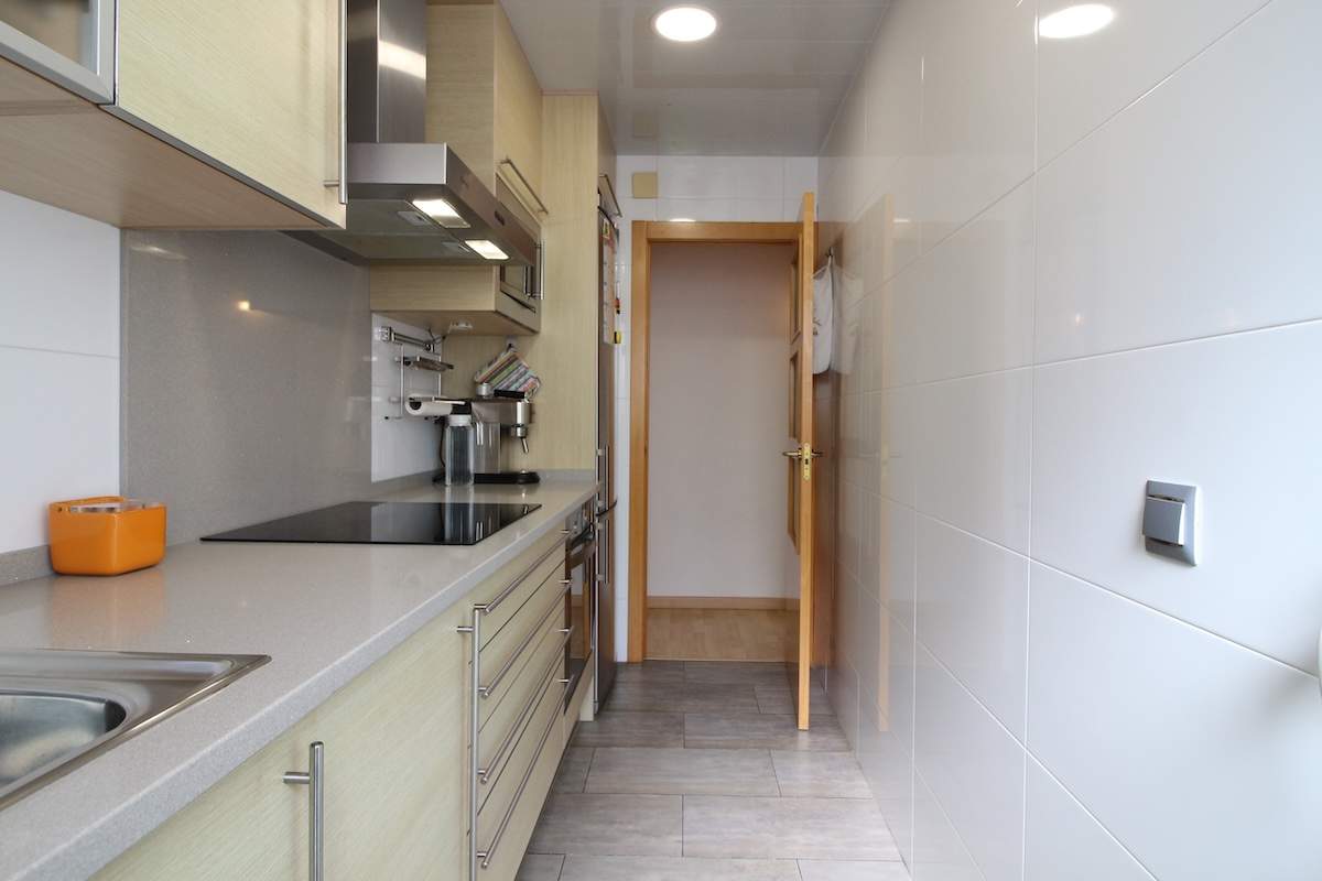 El pasillo recoge, sin alargarlo más de lo necesario, el baño actualizado, de tres piezas con plato de ducha amplio, y una cocina actualizada, alargada, con el espacio bien aprovechado y acceso a una galería donde ubicar la lavadora y el día a día.