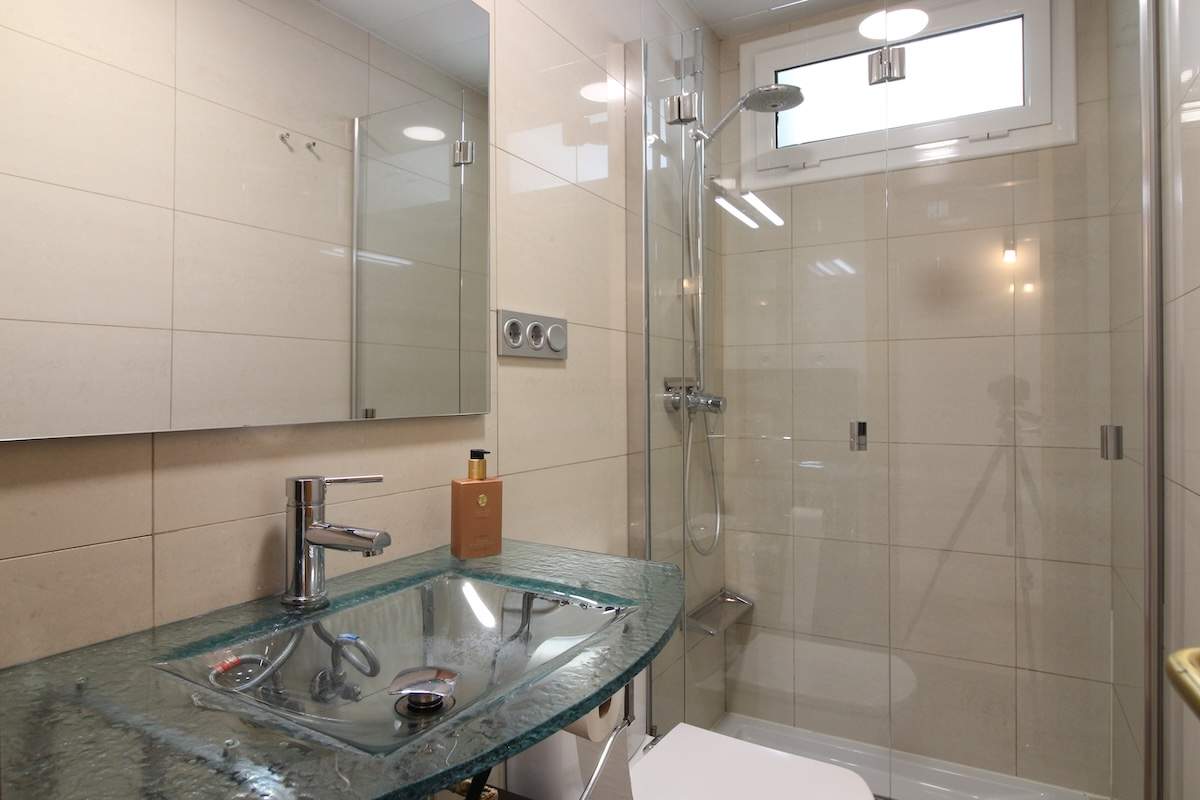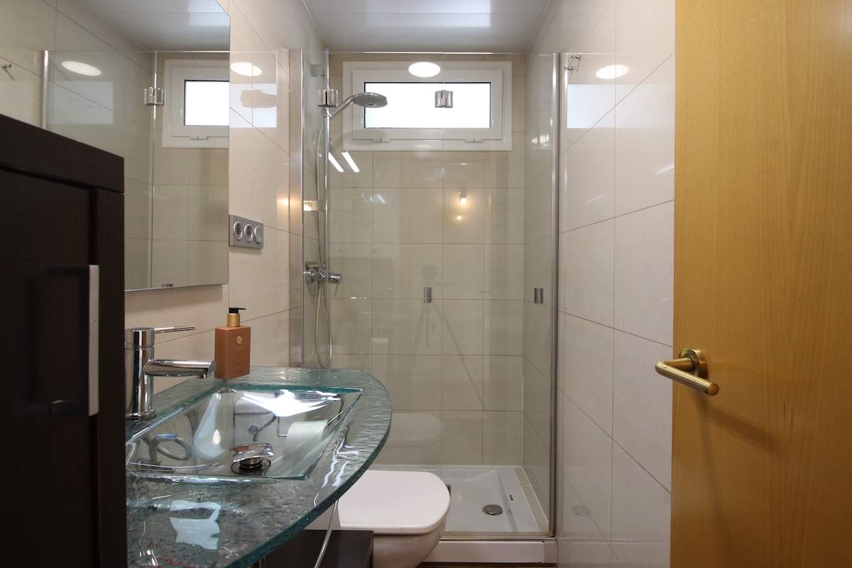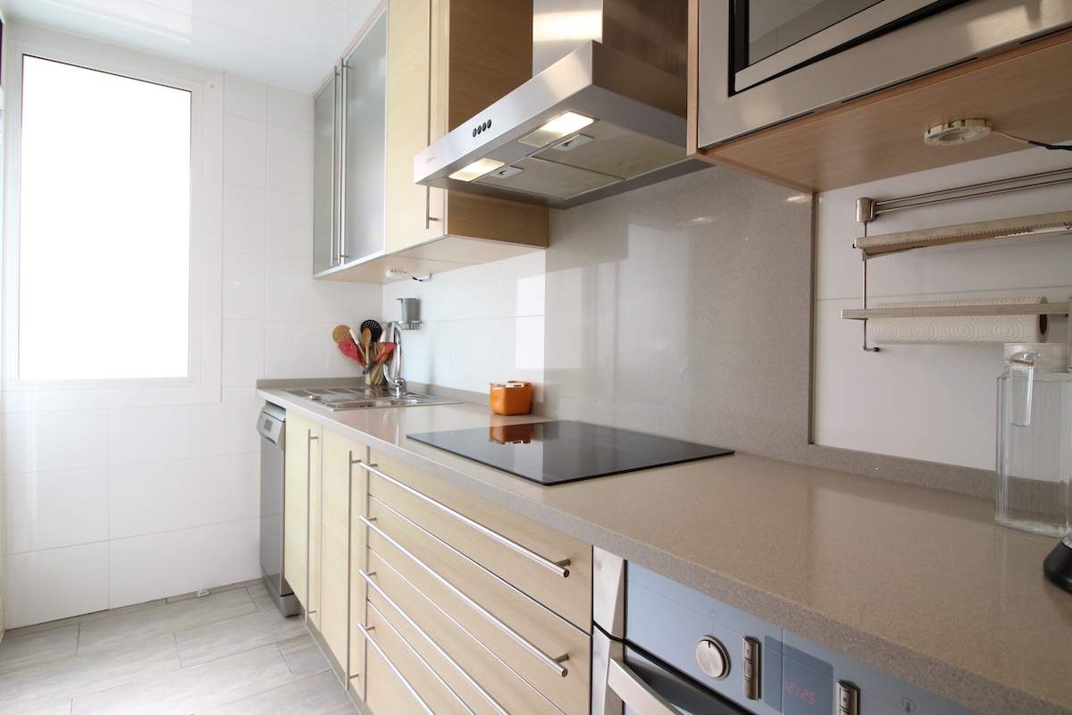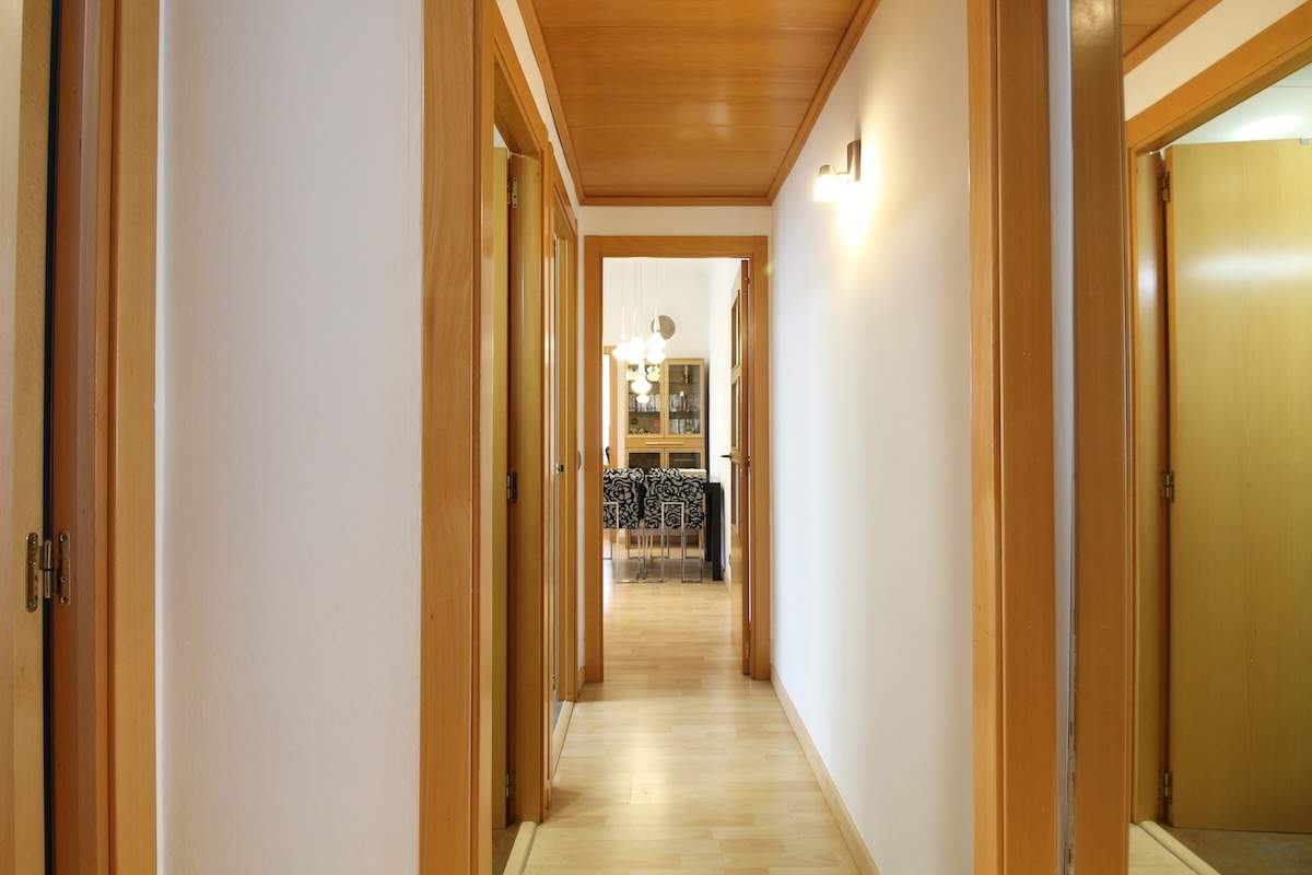 El pasillo recoge, sin alargarlo más de lo necesario, el baño actualizado, de tres piezas con plato de ducha amplio, y una cocina actualizada, alargada, con el espacio bien aprovechado y acceso a una galería donde ubicar la lavadora y el día a día.